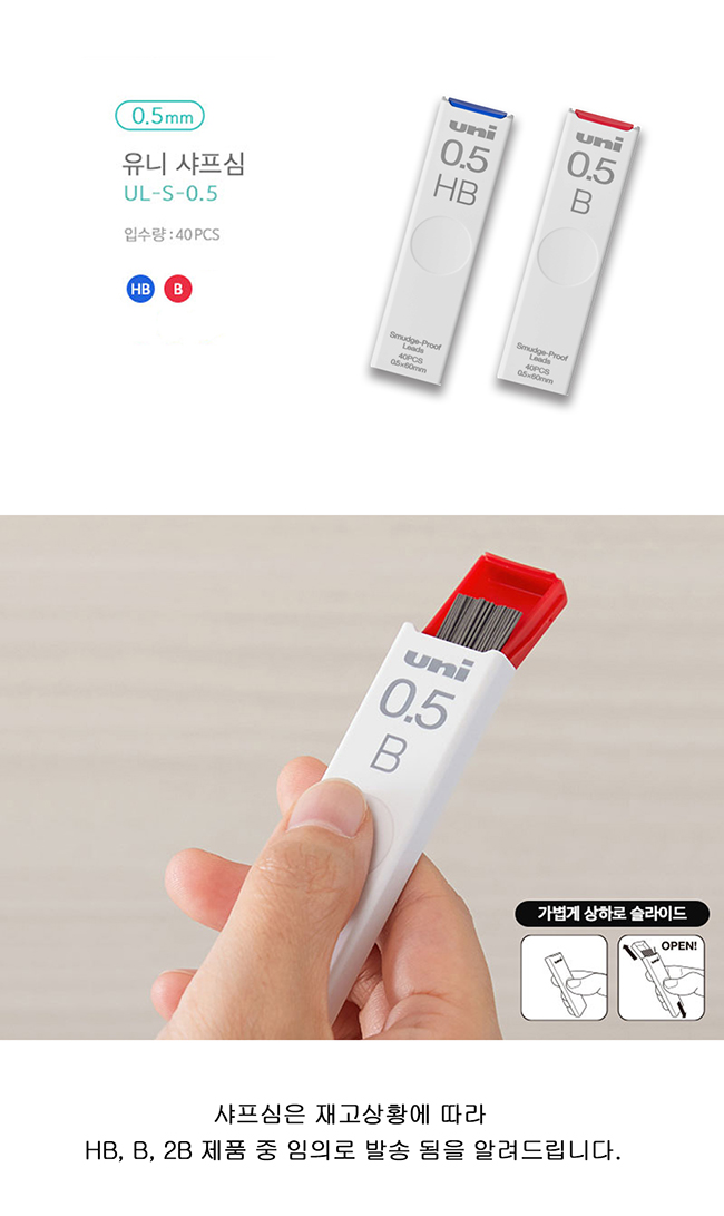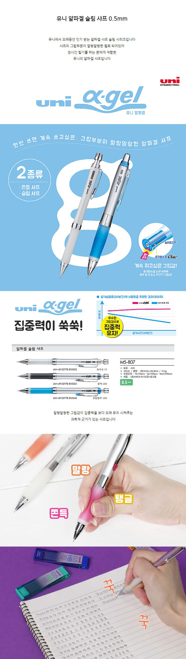 유니 슬림 알파겔 샤프 0.5mm 1개 (색상 택1) + 유니 샤프심 0.5mm 1개 (HB/B/2B 랜덤 발송)